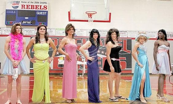 The other item which relates to the photo of Gov Lee of TN in a cheerleaders outfit is what’s known as “Womanless Beauty Pageants” which have occurred for years, mostly in southern high & middle schools. Here are 2 identified as a Florida Middle School