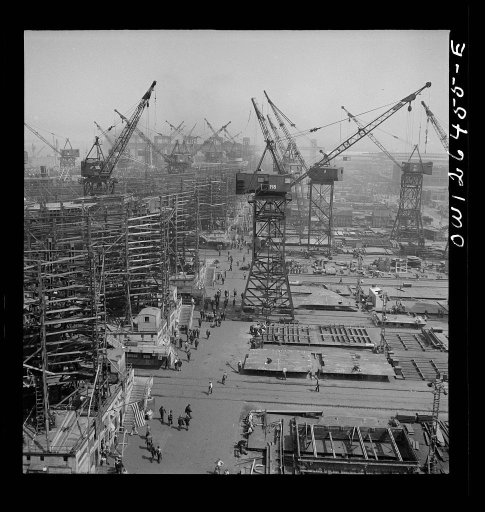 I’m going to focus on one place and time, the Bethlehem-Fairfield Shipyard in the Port of Baltimore from 1940 to 1944 because it’s the example I know the best. In 1940 Bethlehem Steel had a small workforce capable of ship building and a limited physical capability in Sparrows Point, near Ft. McHenry.