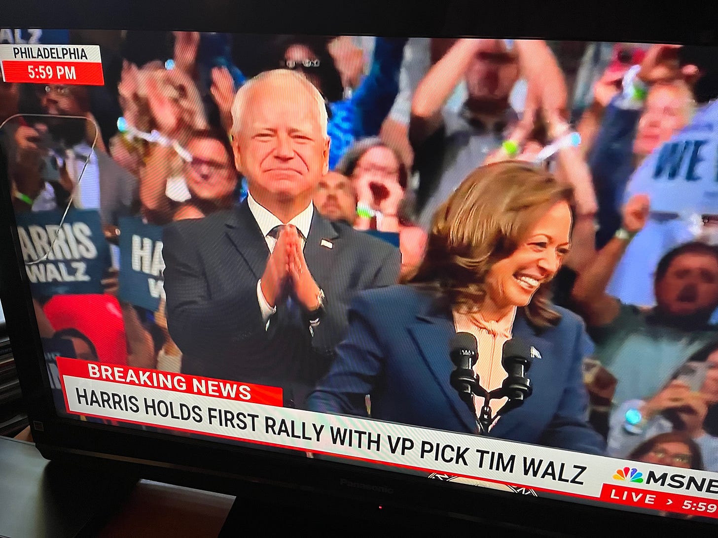At first I was really happy being at home with my wife, sitting in our living room watching the Harris-Walz event unfold…with a good margarita and some stuff to nibble on. It was fun…it was joyful, I was VERY comfortable and felt good.