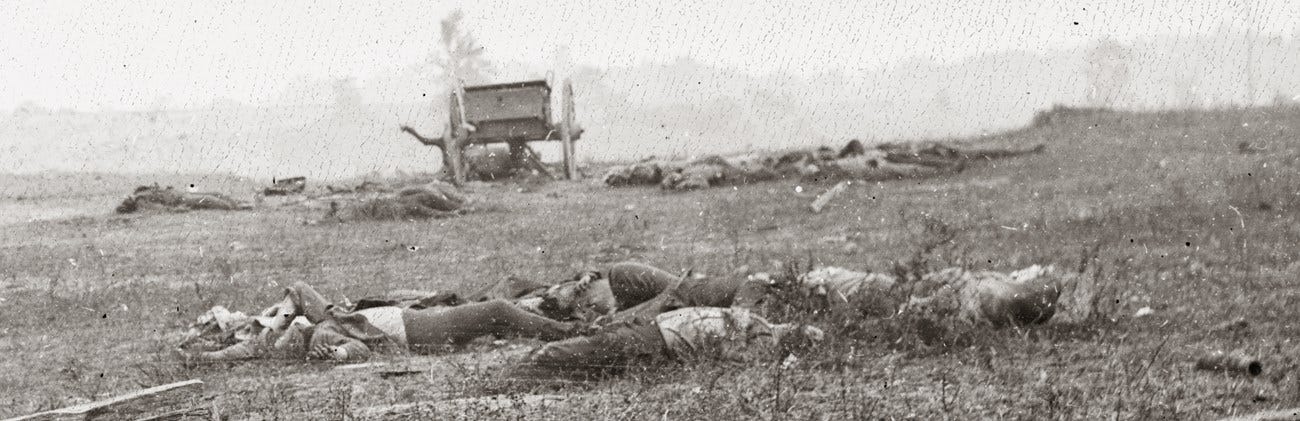 Alexander Gardner would also bring a wagon loaded with chemicals, tin and glass out from DC and take photos that would stun the American people and become iconic images of death on a battlefield.