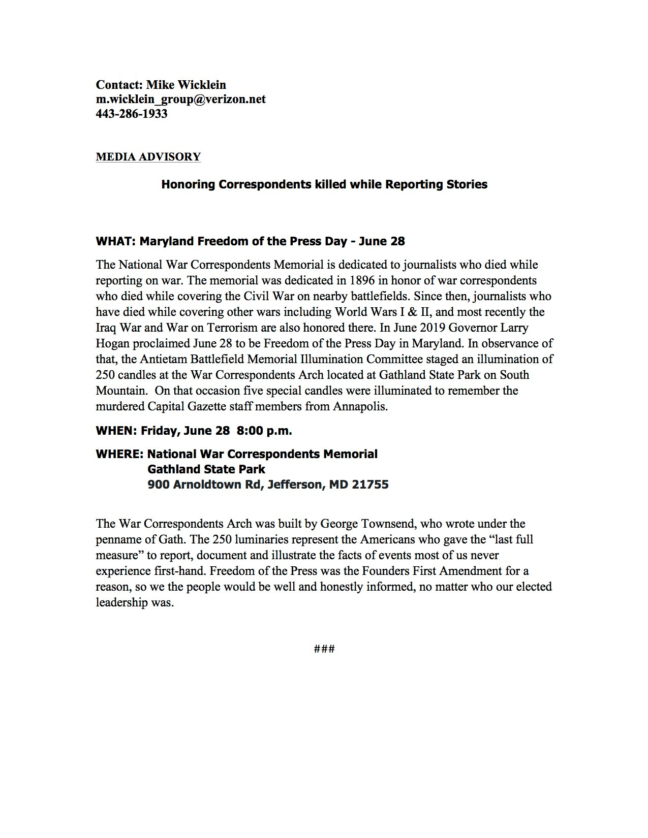 I’m headed to Gettysburg today to scout out a shoot for July 5…and then on to Gathland to produce the annual illumination there to commemorate Maryland’s Freedom of the Press Day. With the help of some Boy Scouts & friends we will set up and light 250 candles to represent the American Journalists who have been killed while doing their jobs.