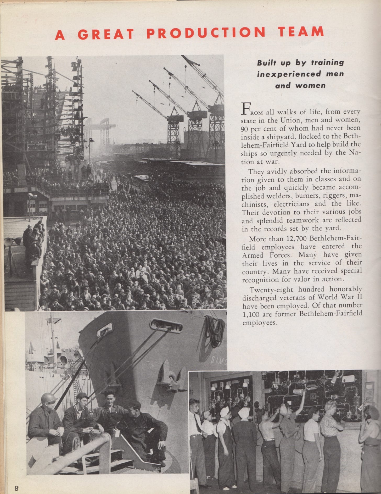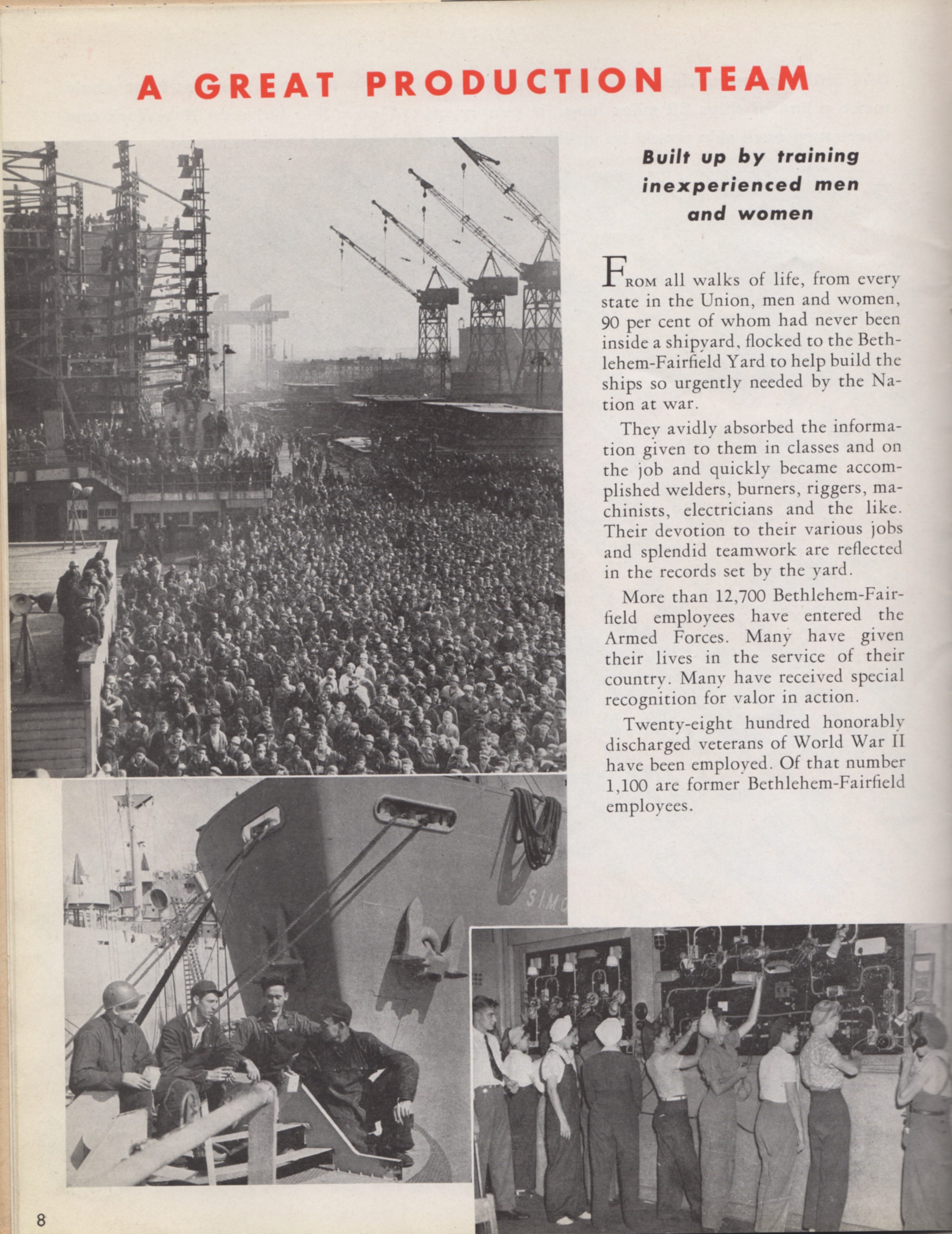 The shipyard worked 24-7…3 shifts a day and employed more people than any other Maryland employer…ever…to this day. They ramped up their production speed from keel laying to ship in the water to about 14 days on average. All Union labor.