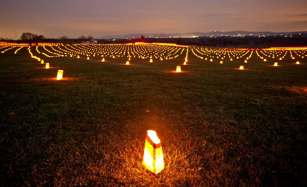December 6 will be the 35th Annual Illumination at Antietam. We have been documenting it for years. About 1500 volunteers, many of them Boy Scouts and school groups place 23,110 luminaries on the field of battle…and folks drive through, starting at 6 PM. If you can make it there you will not be disappointed.