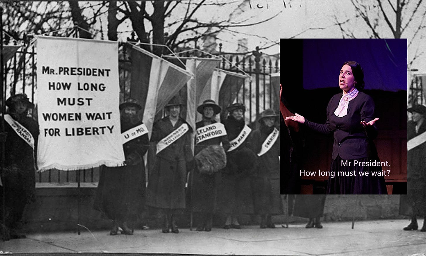 This photo shows Jenna Rose Stein as Susan B. Anthony pleading for the women’s vote.
