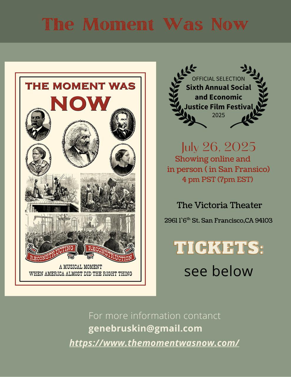 Gene wrote his historical musical, “The Moment was Now” about the reconstruction period with it’s active and important social and labor movements, focusing on their leaders including Frederick Douglass, Susan B. Anthony, William Sylvis, Frances Harper and Issac Myers as the 14th and 15th Amendments were being debated and adopted.