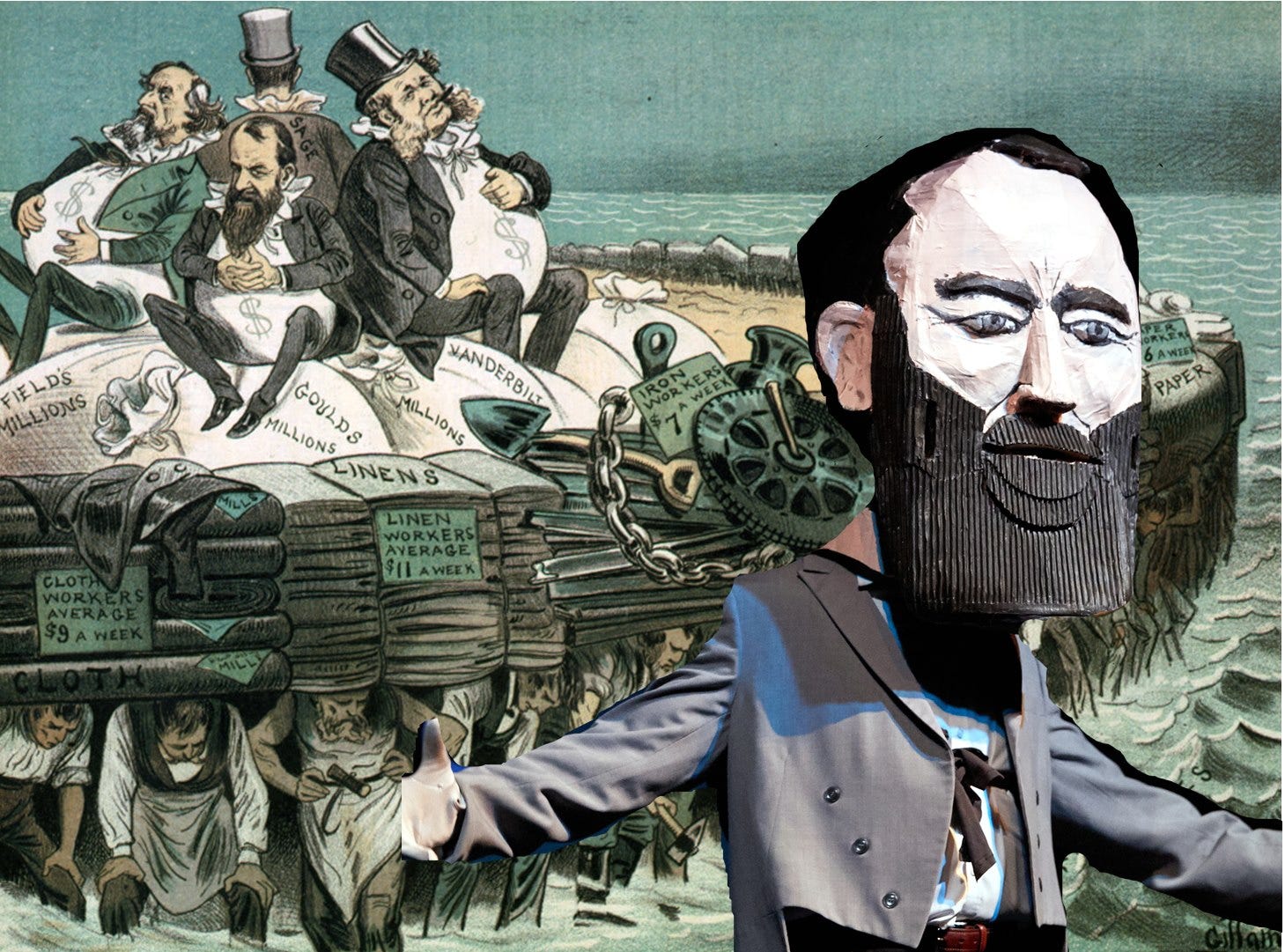 Here is Jay Gould, one of the wealthy Robber Barron’s played by Lecount Holmes Jr. in front of a projected image used in the show. He gets a lot of boos from the audience.