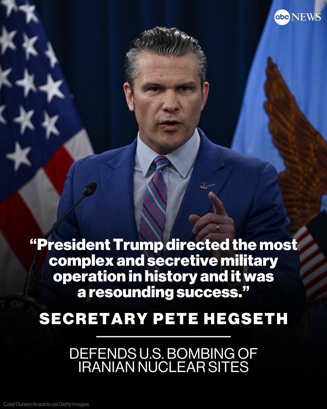 But “most complex and secretive military operation in history…”that’s a pretty bold claim, for a bombing op that occurred in one day, with tested weapons from our inventory and less than 200 delivery and support vehicles. Let’s be VERY clear, neither Trump nor Hegseth had anything to do with the development of the weapons, the testing, the funding or anything that made all of this technology available to them. They had nothing to do with the enlistment or training of any of the pilots, the sailors, the support people, the selection or funding of the contractors or making any of this operation “Midnight Hammer” possible. All of the parts and personnel existed for them to use as they pleased.